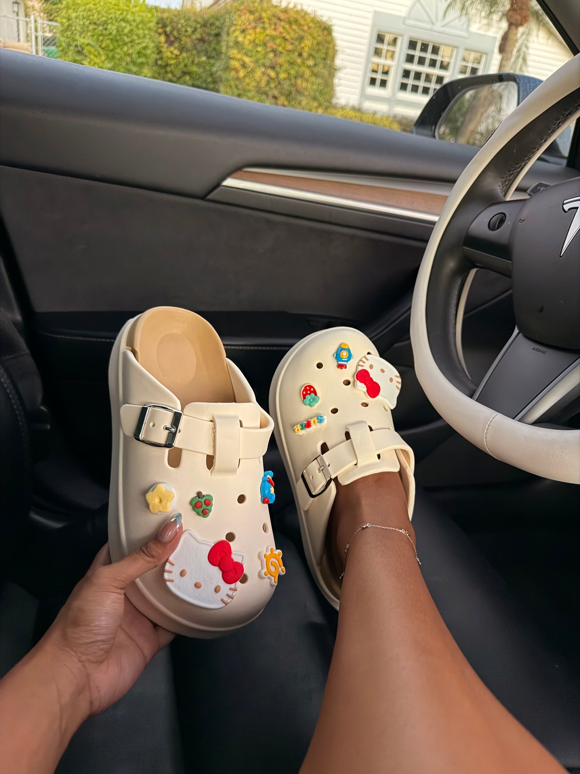 Level up your comfort and your style with our Cream Kitty Charm Clog Mules! These adorable platform-style clogs feature a soft cream color, adjustable buckle straps, and a full set of colorful charms — including an oversized kitty charm in front for the perfect cute finishing touch.
